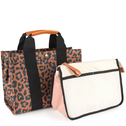 "Kylie" Leopard Nylon Tote with Leather Accents