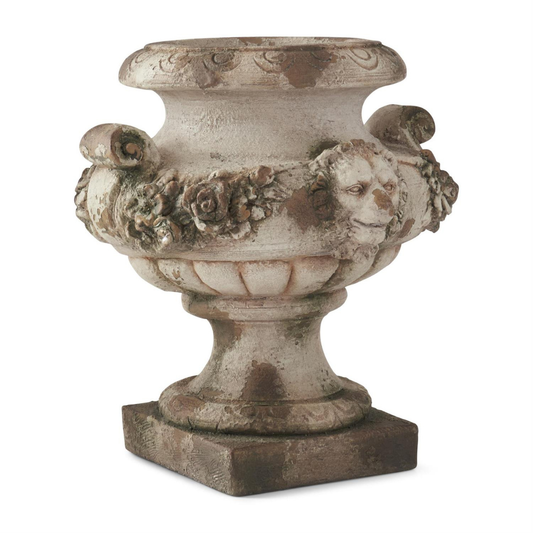 18.5 Inch Weathered Cream & Taupe Lion & Floral Embossed Urn