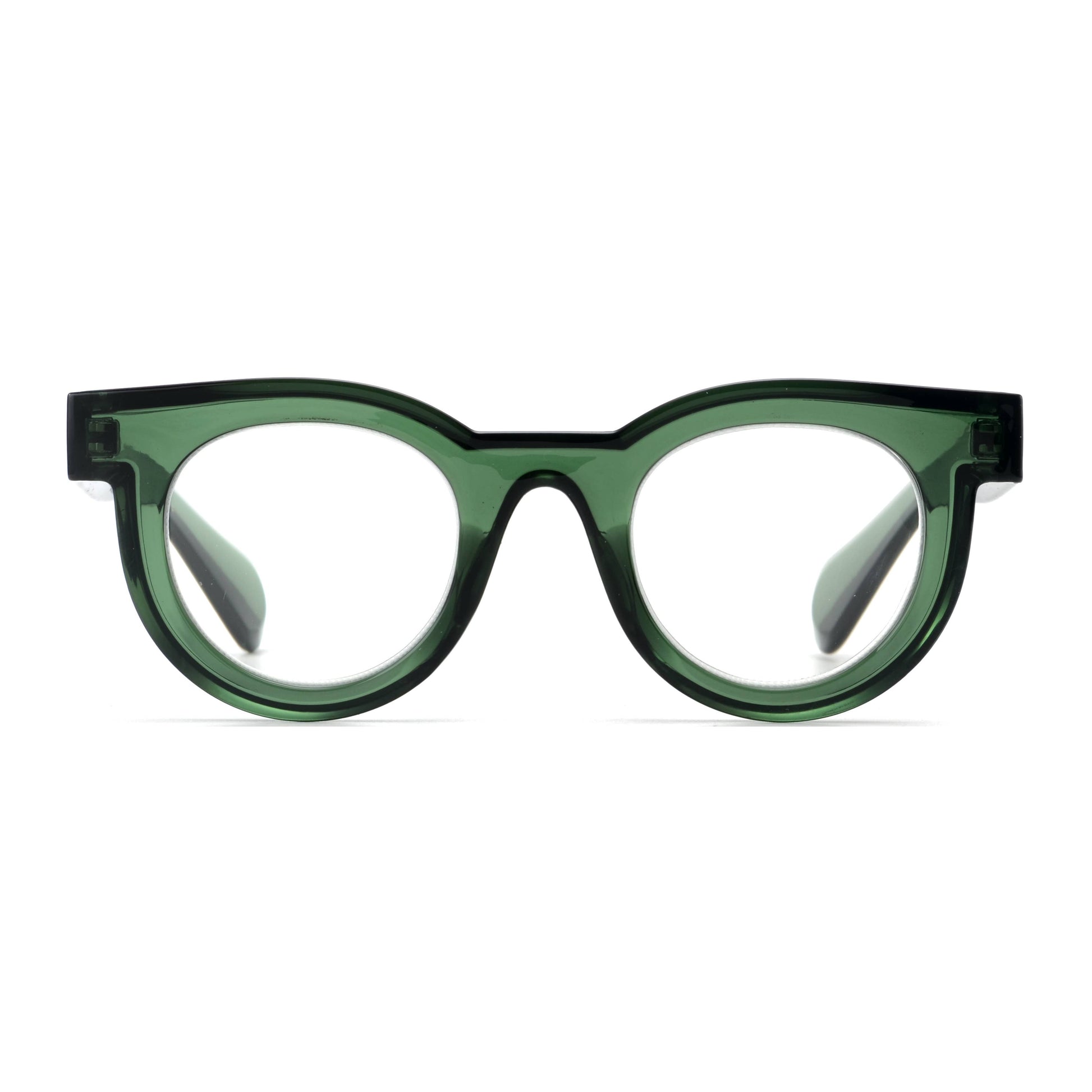 Experience seamless vision across all distances with ARTI's progressive multifocal readers, engineered with advanced blue light blocking technology and a refined lineless design. The sophisticated transparent green frame combines premium polycarbonate construction for exceptional durability with optical precision that transitions smoothly from near to far focus. Ideal for those seeking elegant eyewear that protects against digital screen strain while eliminating the need to switch between multiple pairs. Lens width: 48mm | Bridge: 26mm | Temple: 150mm.