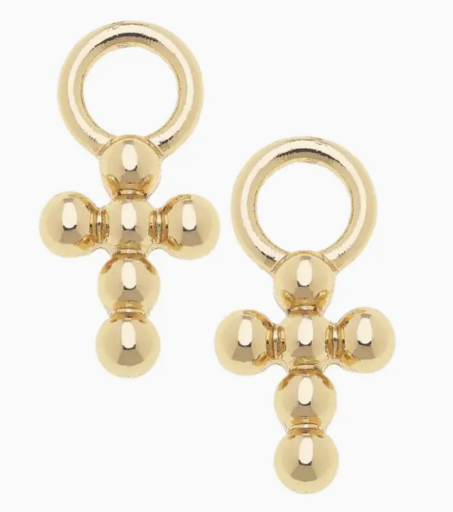 Classic and meaningful, these beaded cross huggie charms in shiny gold combine texture and symbolism for a refined and versatile accessory. DETAILS Base Metal with Shiny Gold Plating 1"L x .5"W