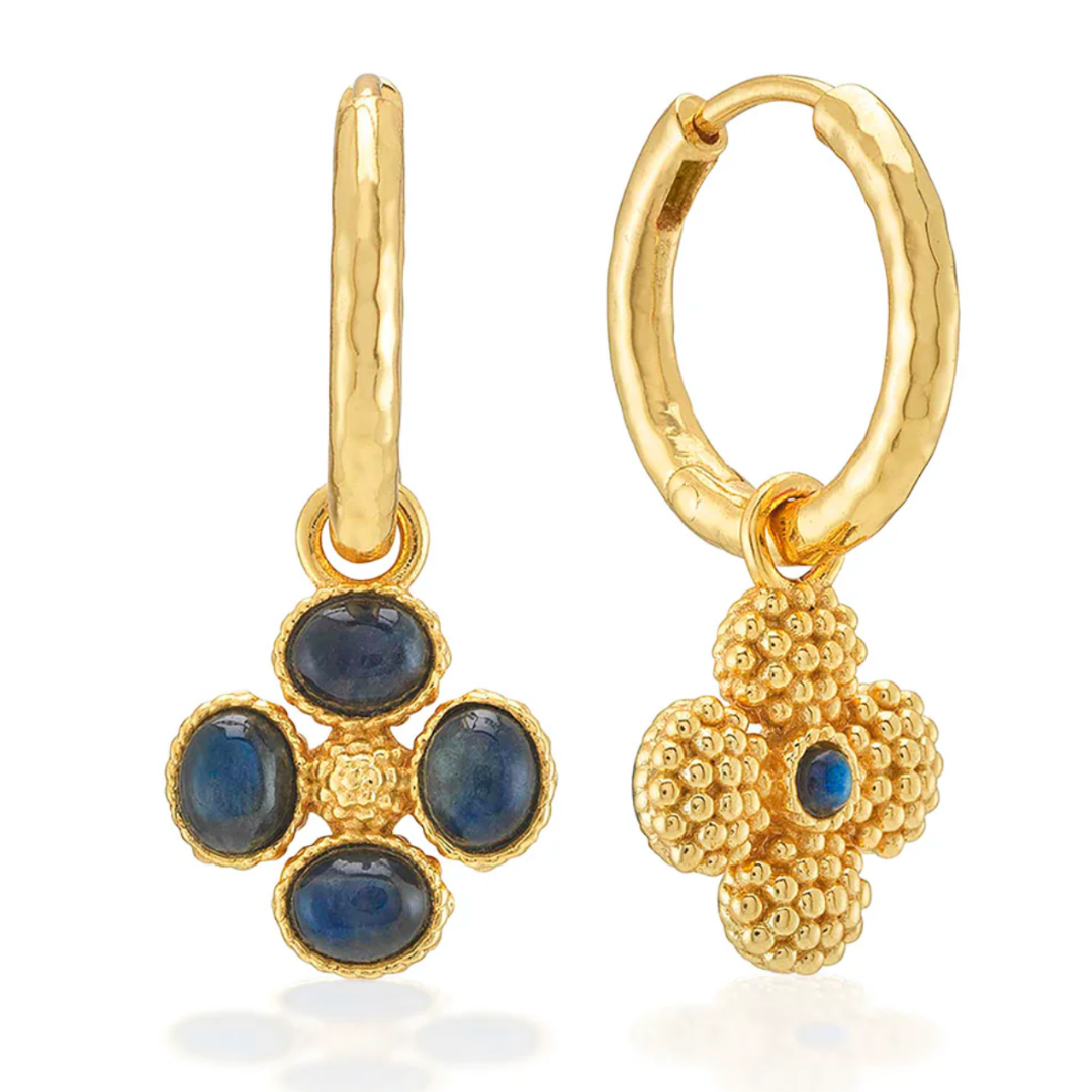 Classic hoops in hammered gold dangle our exquisitely detailed clover charms that are cleverly double-sided so you can choose how you wear them—gilded berry exterior with blue labradorite center or blue labradorite exterior with gilded berry center (or a combination)! Whichever clover you pick, the result is subtly stunning, romantic and unique.