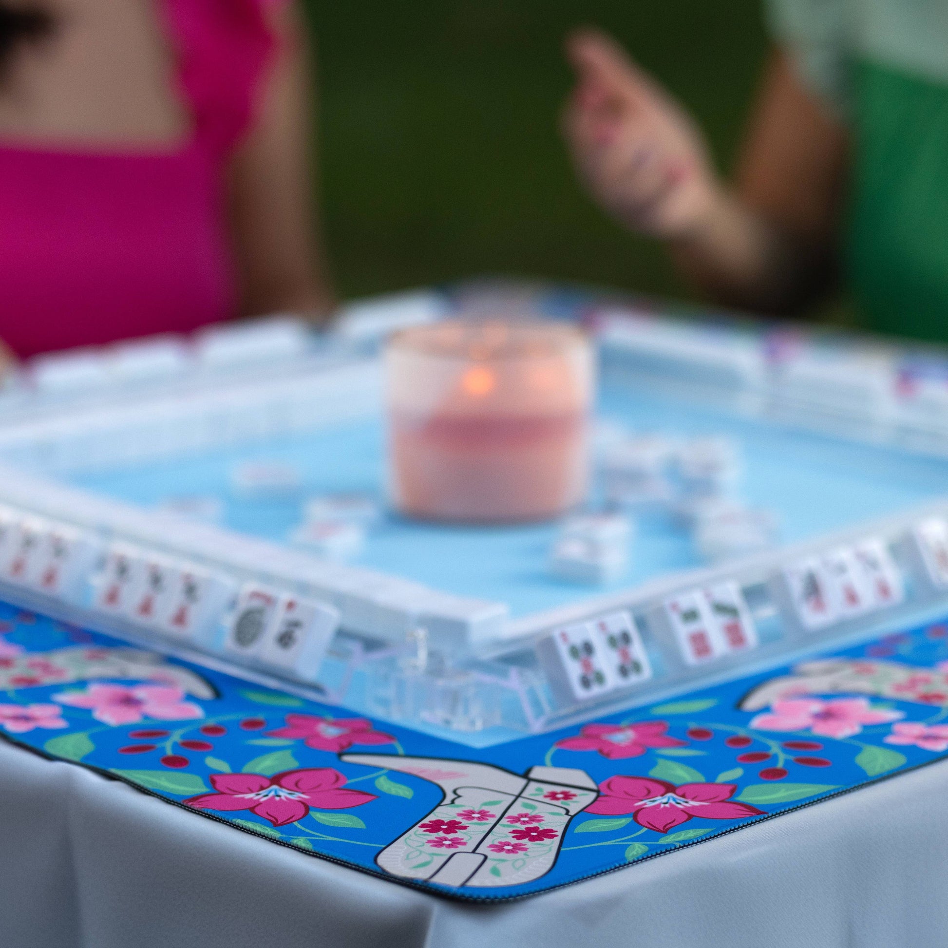 Our beautifully designed mahjong table mat features a non-slip neoprene backing. The design side showcases a silk-like material making it easy to slide cards and mahjong tiles across the table with ease. The mat is 33 in. X 33 in. (2mm thick) making this the perfect table accessory whether you're playing at home with friends or traveling. It fits most standard sized card tables. A great mat for a variety of games, including dominoes, Mexican train, bridge, Bunco, and more. We recommend rolling the game mat after playing for storing. Each mat comes with a custom box that can be used for storing when not using. It is the perfect way to elevate your favorite game.