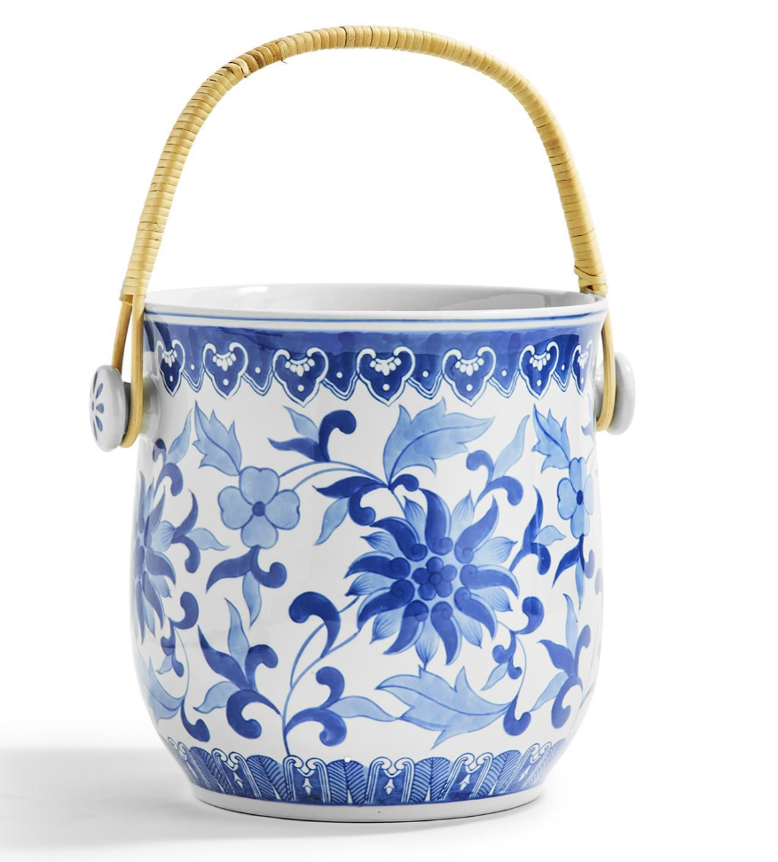 Blue and white will never go out of style! This large Chinoiserie Champagne/Wine bucket will look chic in almost any home. Made from ceramic and accented with a natural bamboo handle that makes it easy to carry.