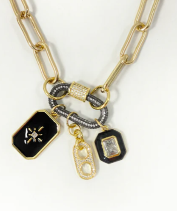 A necklace full of appeal, these pieces will stop you in your tracks. Beautifully layered with charms from a carabiner clasp to complete an absolute fabulous neck jam!