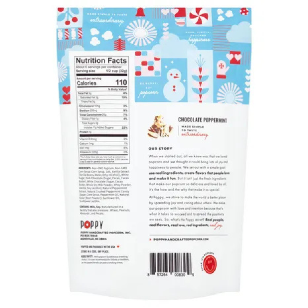 Ingredients: Non-GMO Popcorn, Non-GMO Corn Syrup (Corn Syrup, Salt, Vanilla Extract [Vanilla Beans, Water, Ethyl Alcohol]), White Sugar, Dark Chocolate (Sugar, Cacao, Cacao Butter), White Chocolate (Sugar, Cacao Butter, Whole Dry Milk Powder, Whey Powder, Vanilla, Soy Lecithin), Natural Peppermint Extract, Natural Crushed Peppermint Candy (Sugar, Corn Syrup, Peppermint Oil, Natural Color [Beet Powder]), Sunflower Oil, Sunflower Lecithin.