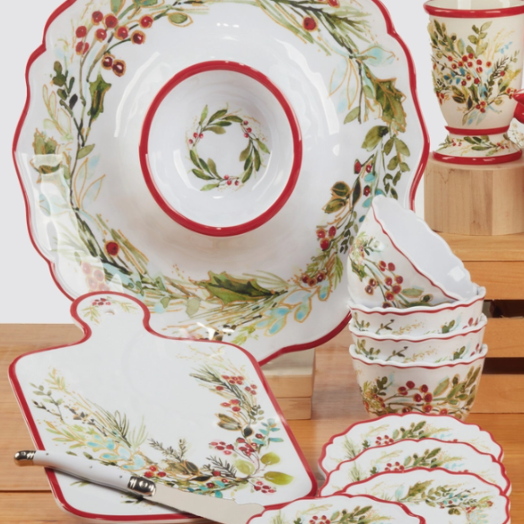 These 4-inch melamine bowls feature a festive wreath of pine, holly, and mistletoe, bordered with a candy cane-striped edge to brighten up your holiday table. Perfect for dips, nuts, or candies, they add a cheerful touch to any appetizer spread. Durable and chip-resistant, they withstand all your holiday celebrations. When the fun’s over, just stack them in the dishwasher for easy cleanup—so you can spend more time enjoying the season’s magic with your loved ones.