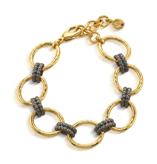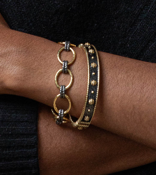 A statement piece fit for the OG (Original Goddess) of unapologetic feminine power, our Cleopatra Grande Link bracelet features an elegant braided motif and oversized links wrought in radiant hammered gold and linked with luscious black rhodium. Like a gilded chariot, this bracelet is a reminder to harness your inner strength and go forth boldly - whether you are reigning over your own kingdom or conquering distant horizons. From crisp white t-shirt to cocktail attire, it looks brilliant with everything, and always will.