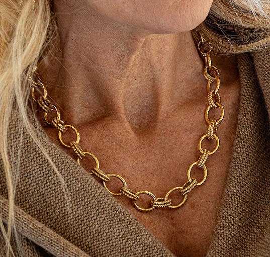 Designed for the modern woman, this statement piece is as timeless as its namesake icon, with abundantly sized links wrought in hammered gold and rendered in a braided motif reminiscent of Egypt’s beautiful wheat fields. Radiating feminine power for reigning triumphant over every occasion and adventure.