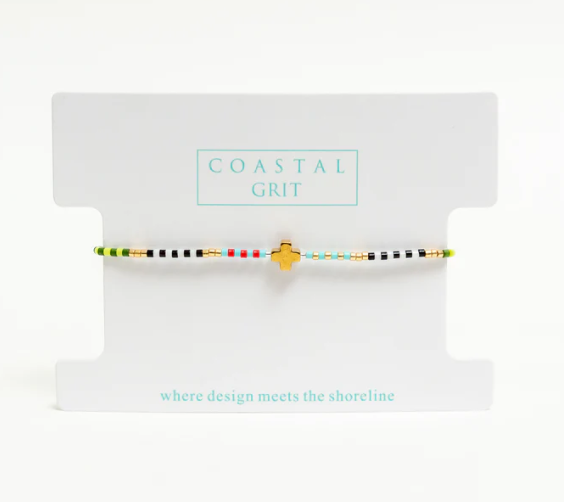 These dainty cross bracelets are made of colorful miyuki seed beads and a gold cross. . The Coastal Cross bracelet is a perfect bracelet to layer with our gold beaded bracelets.