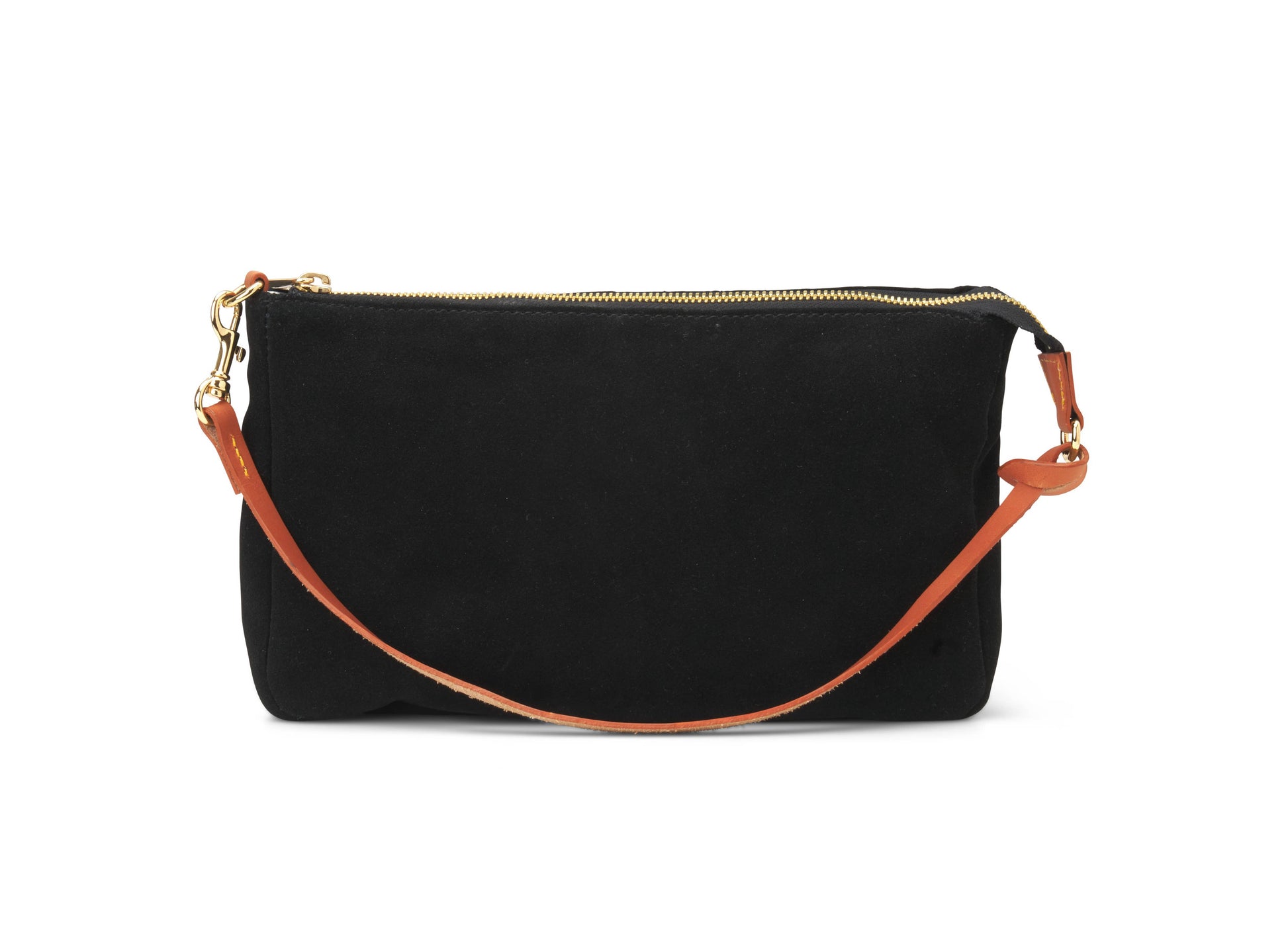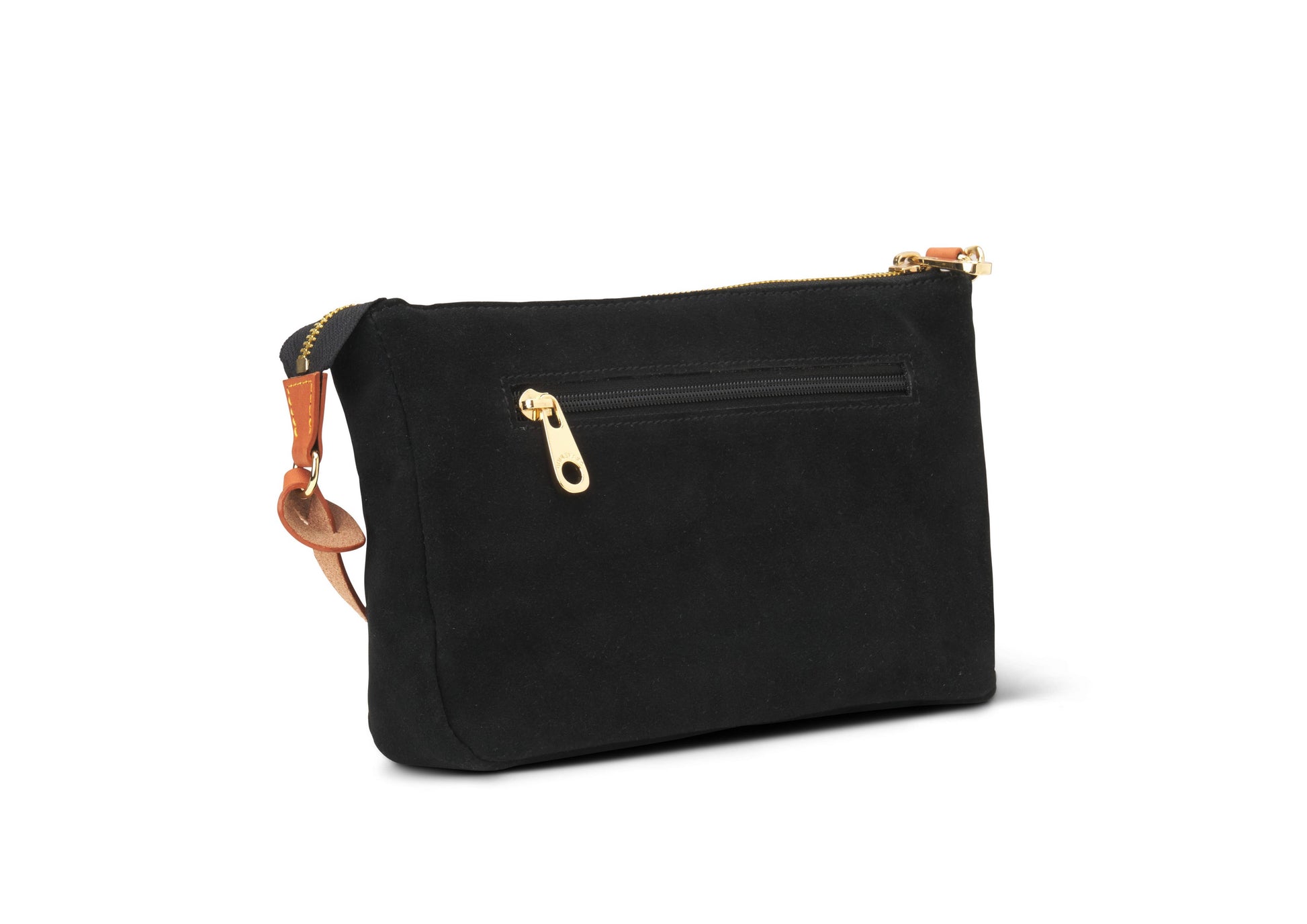 Slim profile shoulder bag perfect for a night out. Made of water resistant suede and leather straps. Colors: Tan leather and Black Suede Features Rich Italian suede Water resistant Vegetable tanned leather shoulder strap Shiny gold hardware Lined Product Care Spot clean suede by brushing with soft cloth. Please avoid contact with dyed fabrics and printed materials to prevent color transfer to suede, and please do not dry clean.