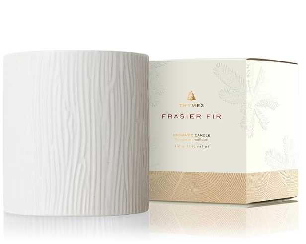 Thymes Frasier Fir Ceramic Medium Candle (11 oz) - Bring the beauty and warmth of this Frasier Fir pine candle to your home with this elegant wood grain ceramic candle with 24-karat gold trimmings.