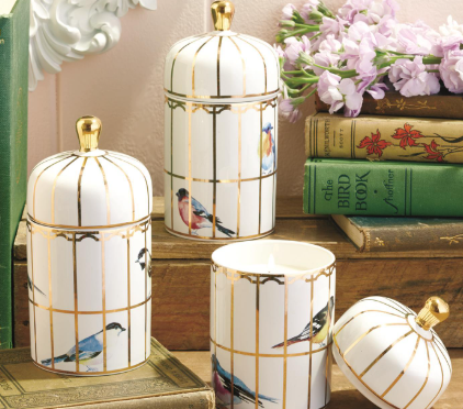 These gilded age candles are adorned with a colorful bird design accented with a metallic gold finish. This lemon verbena scented candle is topped with a beautiful lid, making the scent last even longer.