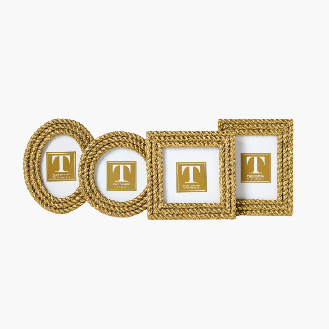 Elevate your cherished memories with our Gold Triple Rope Set of Mini Photo Frames. Crafted from high-quality resin, each frame features intricate rope detailing in a luxurious gold finish. This set includes four unique sizes - oval, round, square, and rectangle - perfect for displaying a variety of photos in style. These mini frames add a touch of sophistication to any space, making them ideal for adorning shelves, mantels, or side tables.