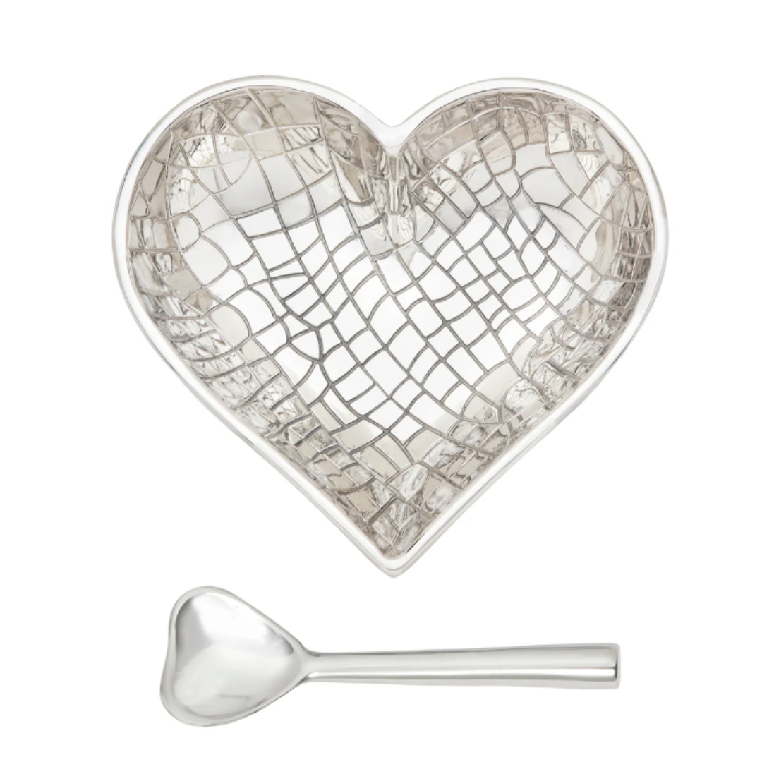 Happy Hearts make it easy to show someone your love! They're available in everyone's favorite colors and patterns! Fill 'em with yummy candies, nuts, snack crackers, chips and dips...or use them as colorful catchalls for jewelry and other small items. A shiny silver Heart Spoon comes with every dish. Happy Hearts nest perfectly with our smaller 4" Tiny Hearts for double the love! Handcrafted of food-safe polished aluminum. Size: 5.25"; Spoon-4"