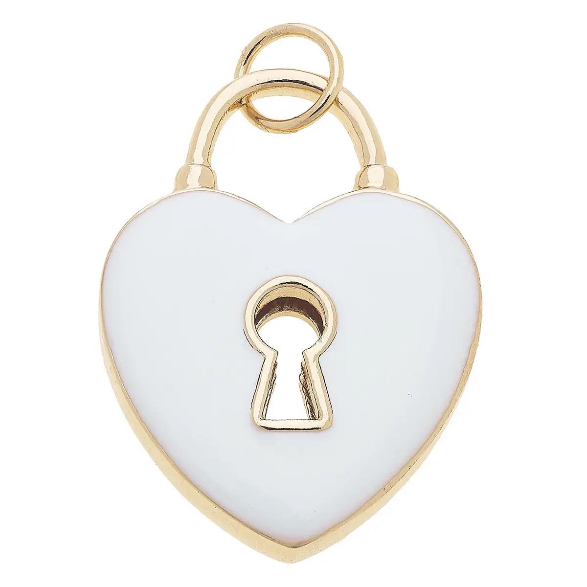 Lock in love with the Heart Shaped Padlock Enamel Charm in white. Its glossy enamel finish and adorable heart design make it a cute and romantic addition to any charm bracelet. Mix & Match and add this charm to our Charm Necklace or Bracelets to show off your unique style. DETAILS: 18K Triple Gold Plated 1.4"L x 1"W