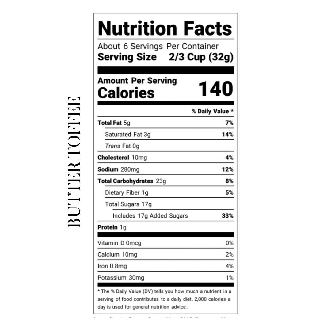 Butter Toffee (6.5 oz): Toffee popcorn made with real butter, brown sugar, and a touch of sea salt. Simple and delicious.