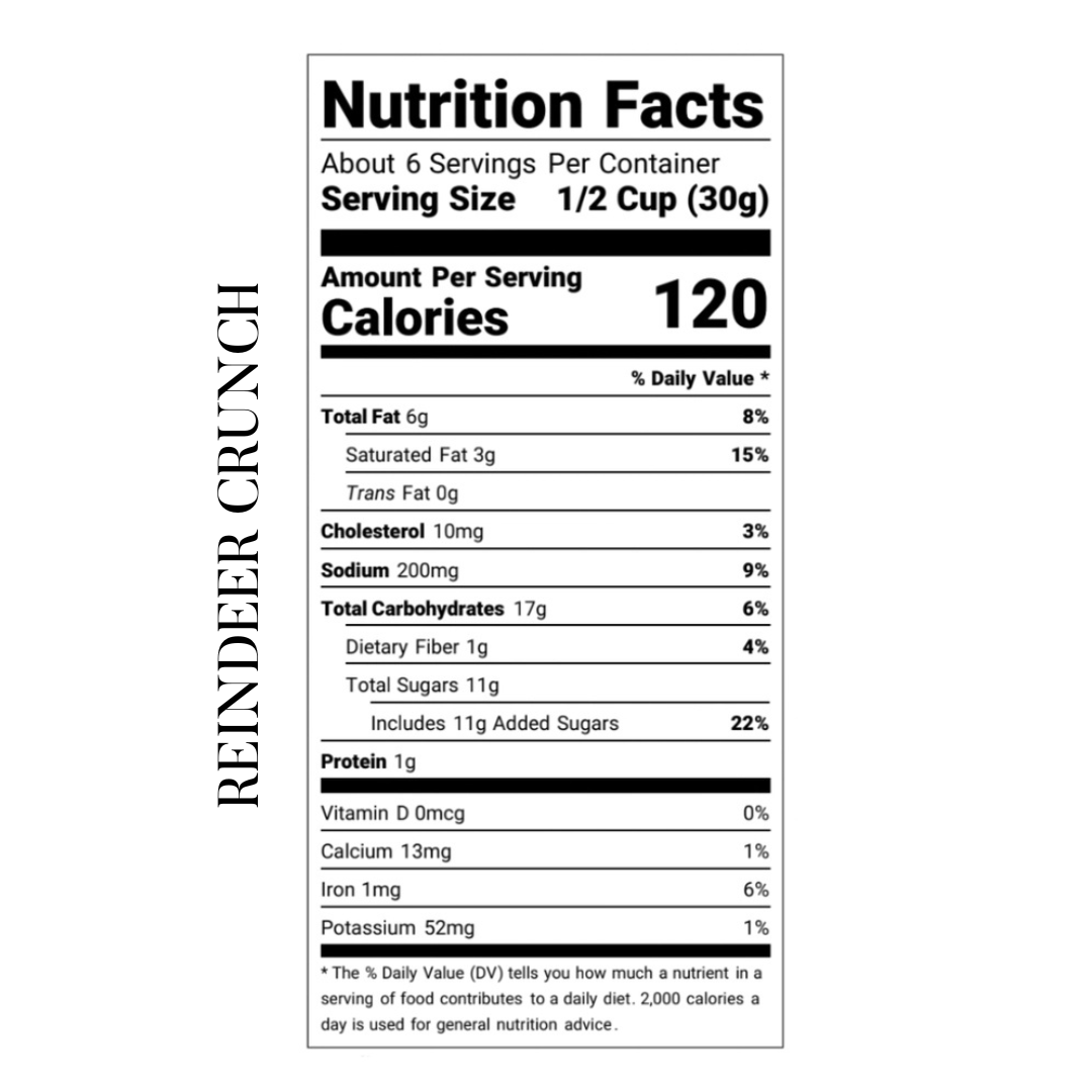 Reindeer Crunch (6.75 oz): Salted Caramel popcorn with caramelized pecans and almonds, finished with a chocolatey drizzle.