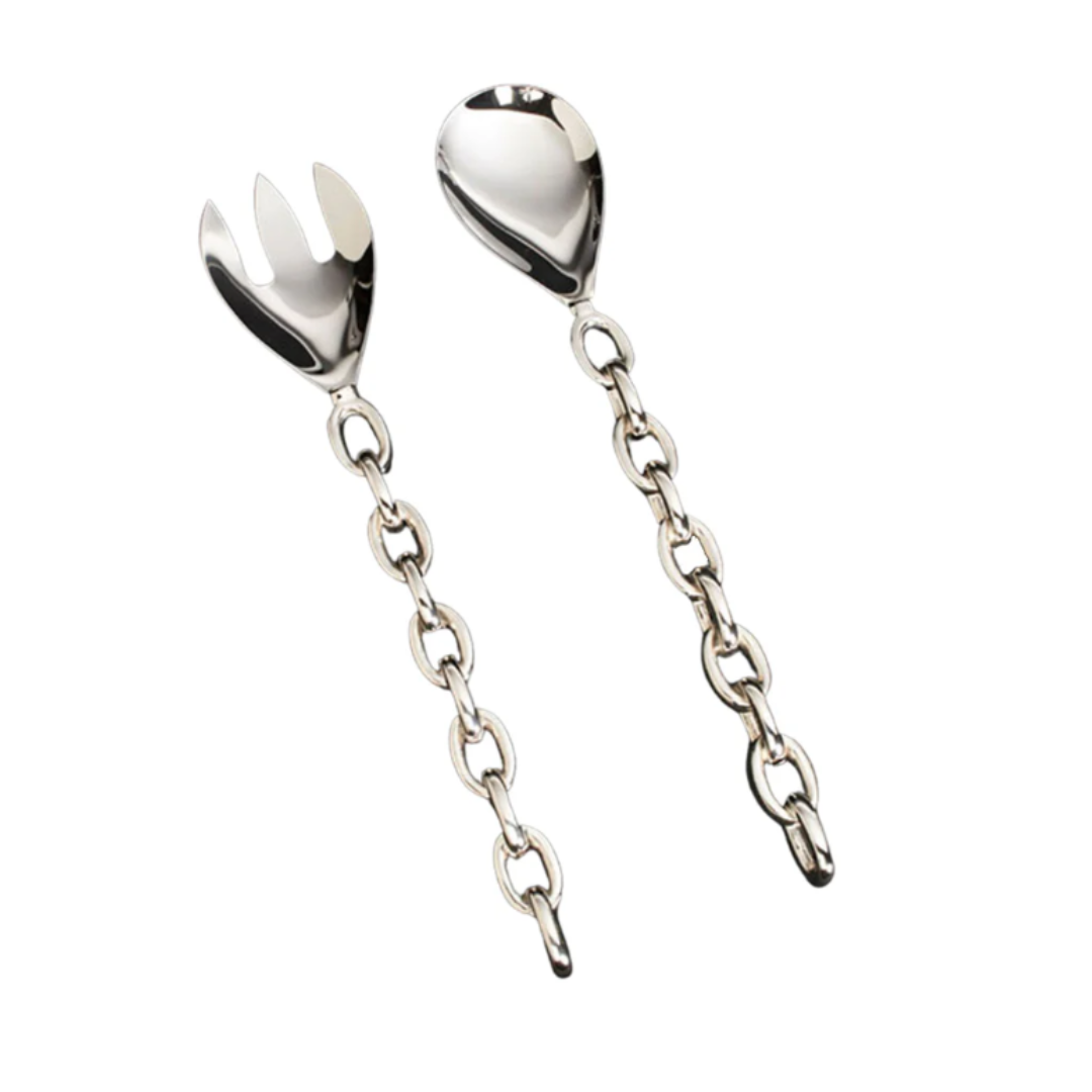Featuring bold chain-link detail and long handles, the Linky Salad Set is cool & edgy. The collection includes a variety of eye-catching serving pieces & accessories. Handcrafted of food-safe polished aluminum and stainless steel. Size: 12"