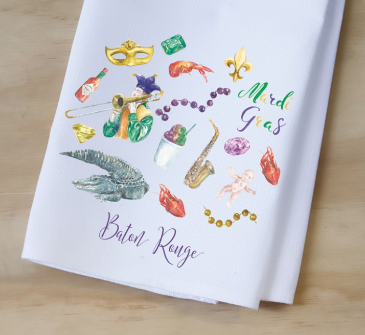 Mardi Gras is here! Designed and manufactured in Calhoun City, Mississippi, add these to your kitchen or guest bath for a fun and personalized touch. Towel measures 24" x 14," imprint area is approximately 8" x 8". Our designs are dyed directly into the fabric, so they won't peel or crack. Machine washable, (Warm, Tumble Dry- Low). Fabric is 100% Polyester.