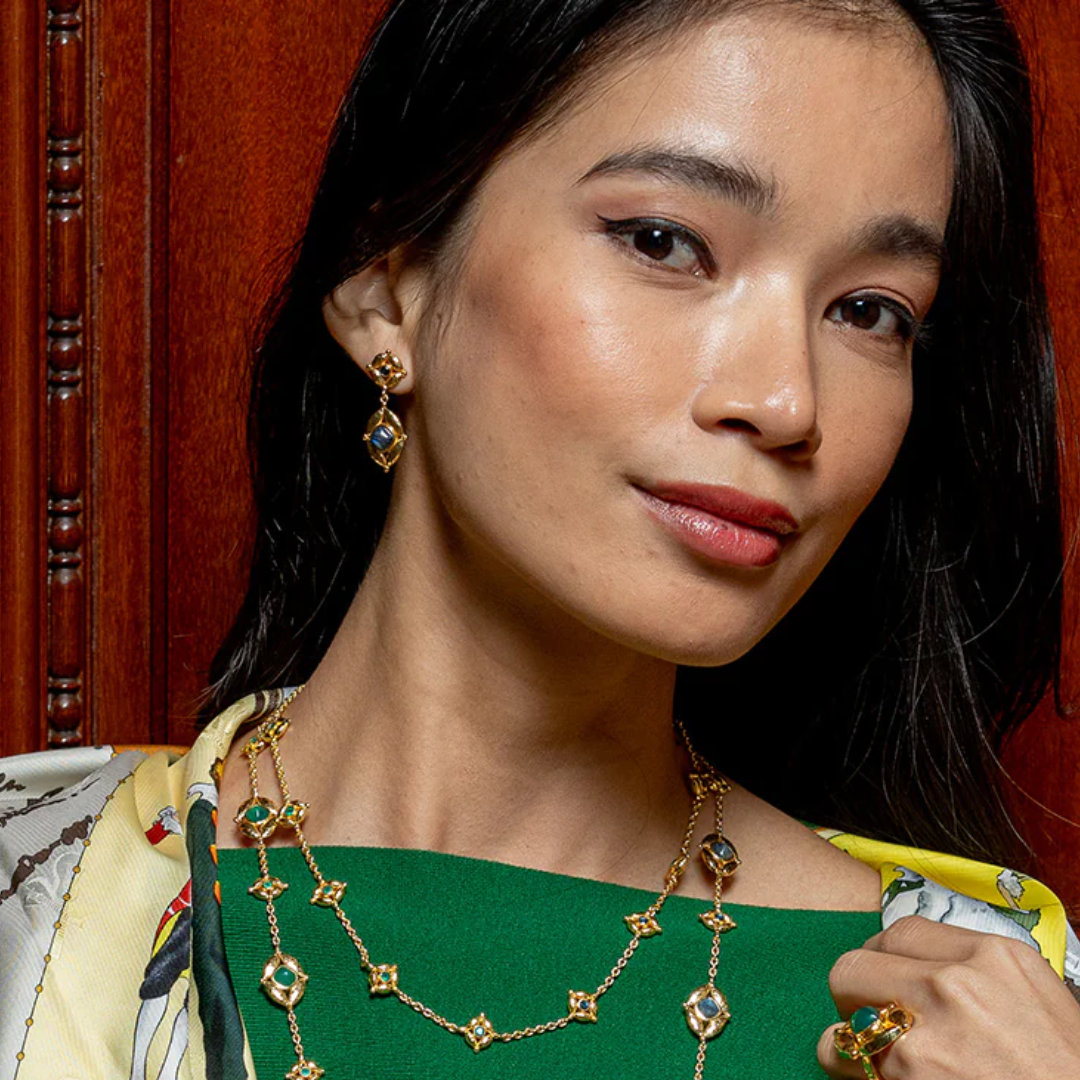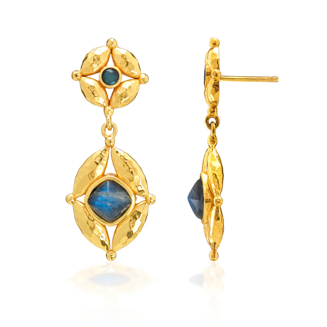Discover the allure of our Mystic Eye Post Drop Earrings, where captivating blue labradorite stones meet lustrous hammered gold in a design that transcends occasion. These handcrafted pieces blend timeless elegance with modern edge, moving seamlessly from boardroom to evening out. Measuring 1.39" L x 0.58" W x 0.82" H, they're crafted from 18K gold-plated brass and natural blue labradorite. Each pair is individually made in India, showcasing subtle variations that honor the artisan's touch. Protect your investment by keeping them away from water, lotions, perfumes, and chemicals. Trust your instincts—let these striking earrings amplify your inner confidence.