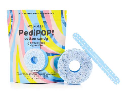 Pamper your feet with PediPOP! Spongelle’s® innovative All-in-One Pedi Treatment includes a pedi buffer with built-in cleanser and nail filing system.