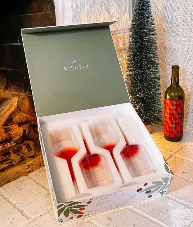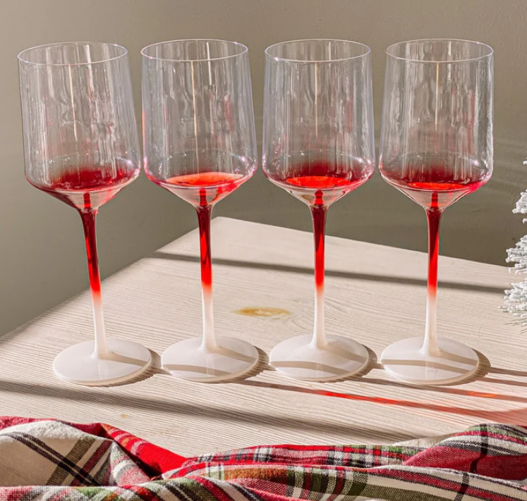 Elevate your holiday celebrations with our exquisite set of hand-blown wine glasses, a perfect fusion of craftsmanship and festive flair. Our "peppermint" glasses consist of a red colored bowl which transitions midway down the stem to a frosted white base.. This set of four comes impeccably packaged in luxury packaging, making it an ideal gift or a lovely addition to your own table setting. Cheers to joyous moments and cheerful sips!