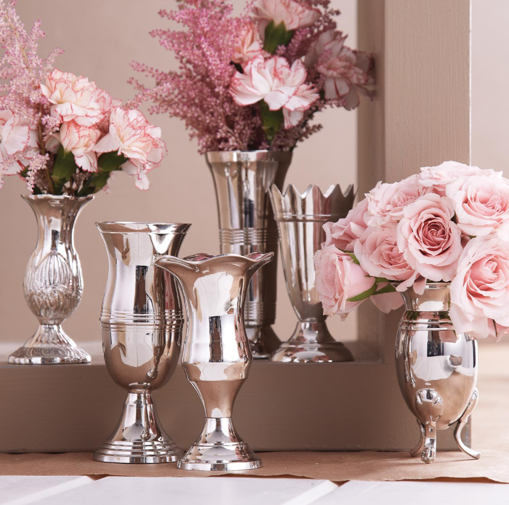 While traveling through Europe, we were enamored by the many antique designs. These eye-catching silver-plated brass vases are replicas of those charming old-fashioned pieces. The sleek designs can be used with Live or Silk Flowers.