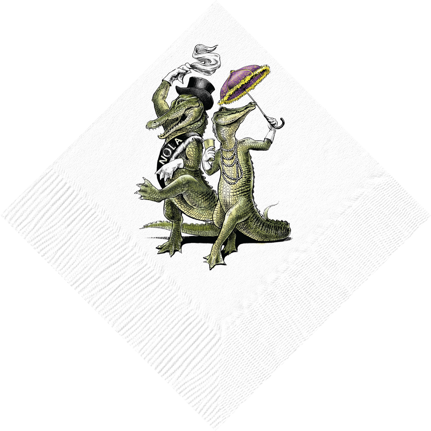 Transform your gathering into a celebration with these charming alligator cocktail napkins inspired by New Orleans' vibrant spirit. Each 5-inch square napkin features hand-drawn artwork created in a local atelier and printed on durable 3-ply paper in the USA. Perfect for Mardi Gras festivities, weddings, or any festive occasion—whether you're entertaining an intimate group or a crowd of 200. Pack includes 20 napkins ready to add a touch of whimsy to your table.