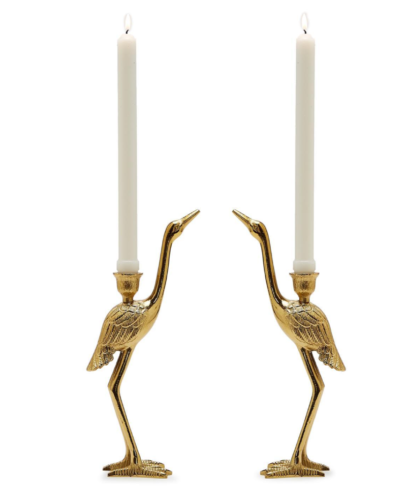 Bring the elegance of nature into your home with these pairs of cast aluminum hand-finished golden taper candle holders/sculptures. A pair of cranes show off their graceful legs and elongated necks creating a graceful decorative accent and candle holder.