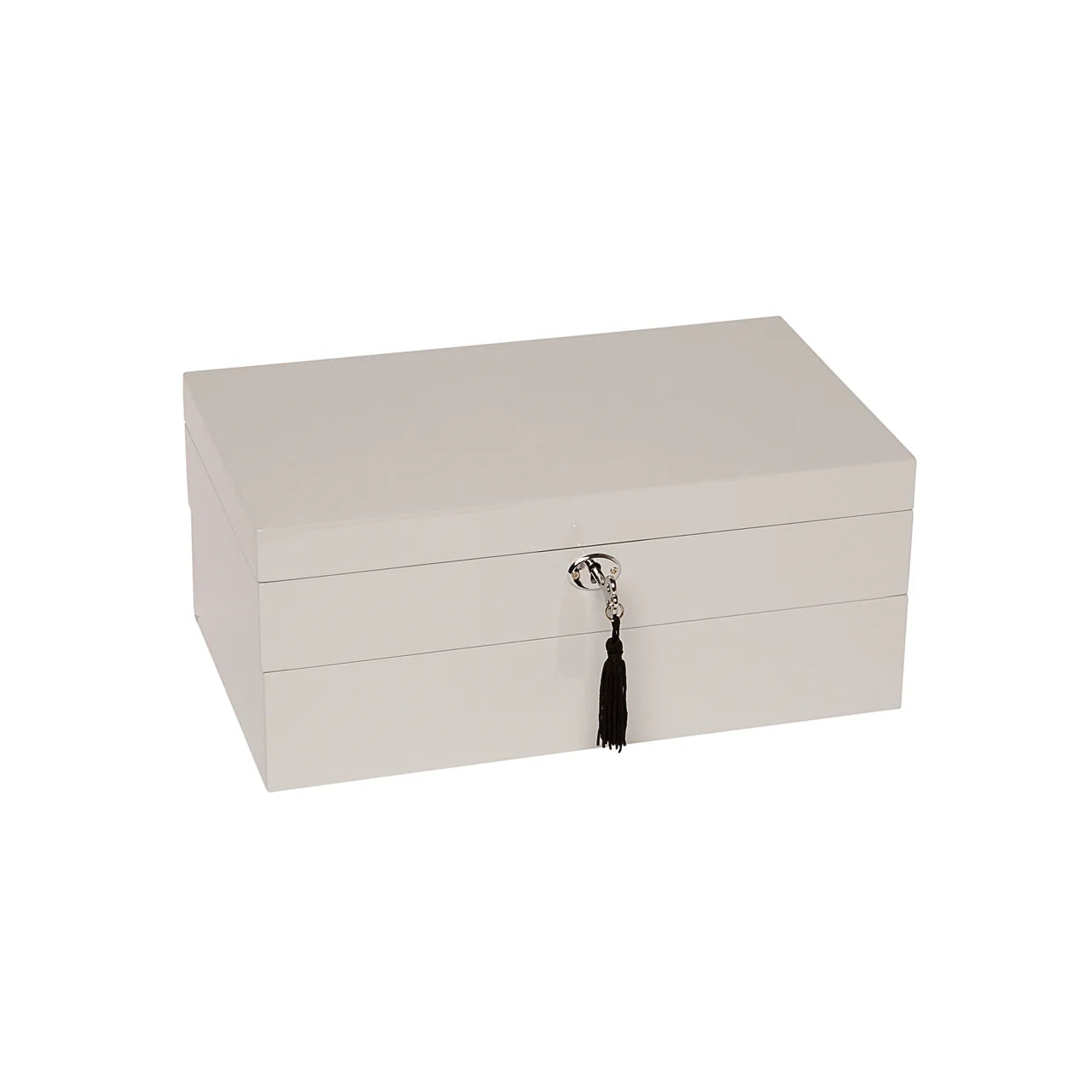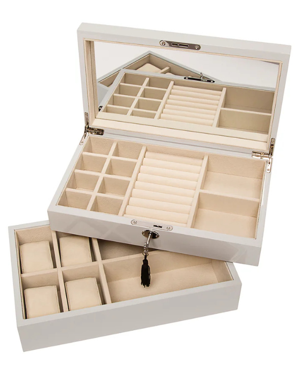 OPRAH'S PICK! The Brouk and Co stacking 2- piece set is handcrafted in superior high-gloss lacquer finish with an ultra-suede soft interior lining. The set includes 2 levels that can be stacked or used independently. The top level features a beautiful hinged top with interior mirror and compartments for your rings, necklaces, bracelets, and earrings. The lower tray features four ultra-soft pillows for your watches with 2 larger compartments for your eyewear pieces or other accessories!