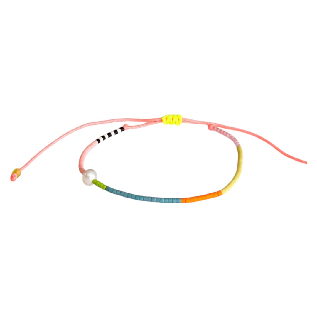Fun, colorful patterns accented with a freshwater pearl make the perfect summer bracelet. Adjustable string bracelet fits sizes 5.9" to 10"
