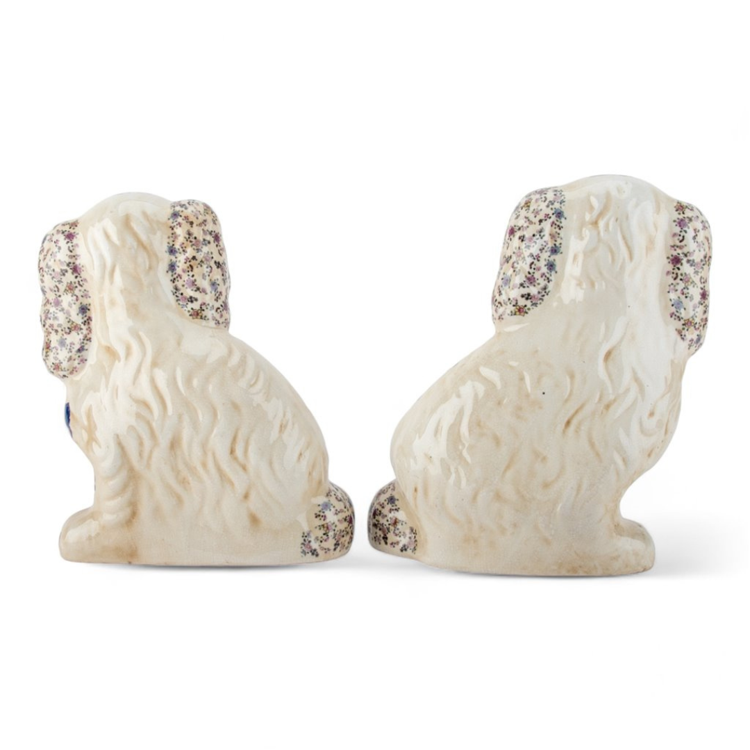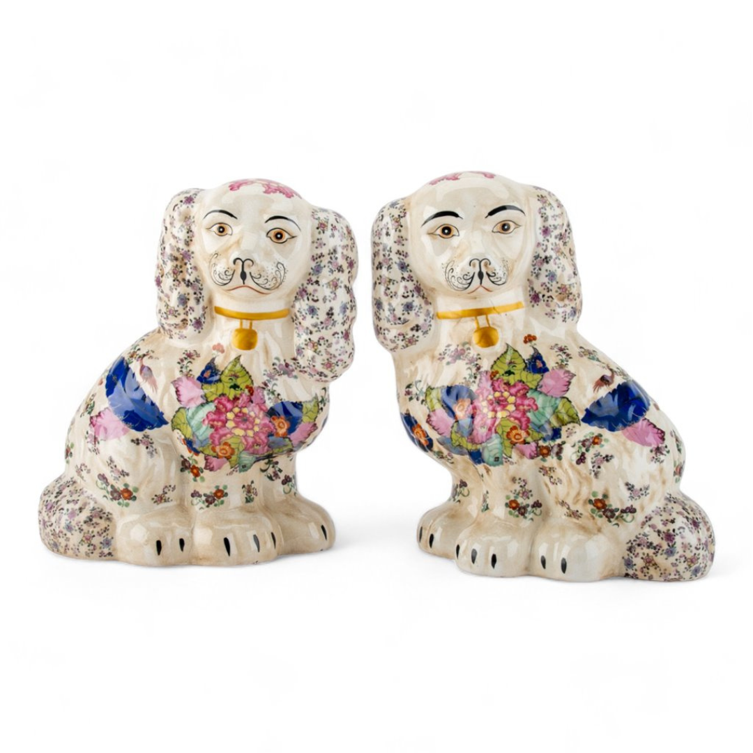 Elevate your décor with this distinguished pair of porcelain Staffordshire spaniels, reimagined in an exquisite tobacco leaf motif. Standing at an impressive 12 inches tall, these generously scaled companion pieces blend timeless elegance with refined artistry, making them an ideal statement accent for curated interiors and discerning collectors alike.